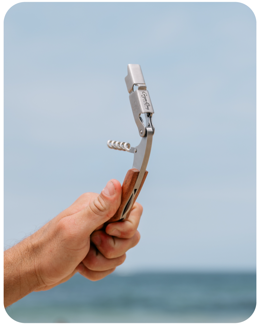 Every home bartender can impress with this branded, compact wine bottle opener with knife blade and cork screw. Add a touch of retro classic to your next dinner party. Stainless steel and wood.
